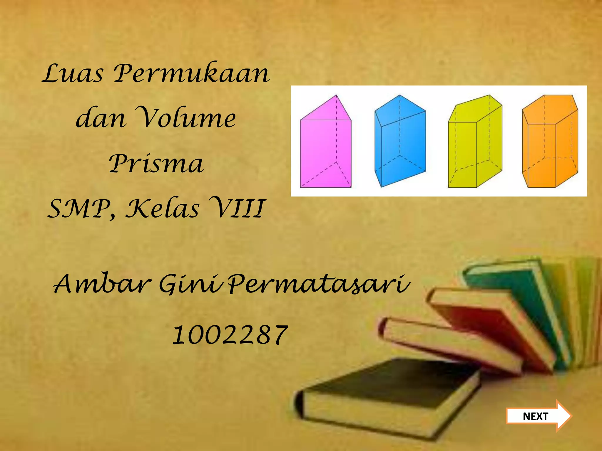 Dokumen ini membahas rumus luas permukaan dan volume berbagai jenis prisma, termasuk prisma segitiga, segiempat, dan segi-n. Terdapat penjelasan tentang penghitungan luas permukaan dan volume, serta contoh soal yang diikuti dengan jawaban. Materi ini ditujukan untuk membantu siswa SMP kelas VIII memahami konsep dasar geometri yang berkaitan dengan prisma.