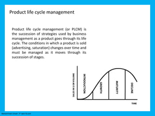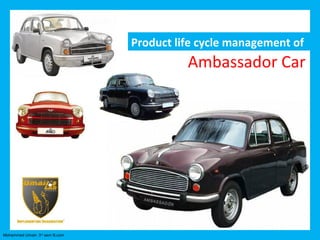 The document summarizes the product life cycle of the Hindustan Ambassador car in India. It describes the origins of the car as a license-built version of the Morris Oxford III in 1958. Over several decades and models (Mark I to Mark IV), few changes were made to the car's frame. In later phases (1990s onwards), more changes like new engines and cosmetic updates were introduced in models like the Nova, 1800 ISZ, and Classic. The most radical revision was the Avigo launched in 2004, which had a new design but retained the rear. The Ambassador has been in continuous production since 1958.