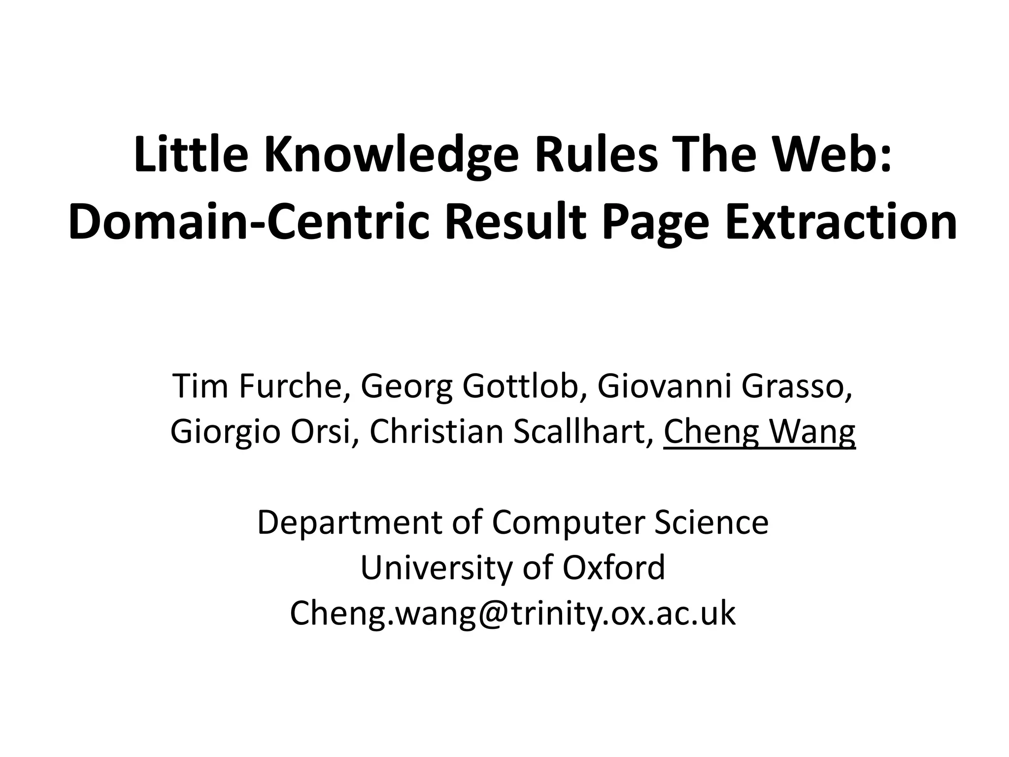 The document describes AMBER, a system for extracting structured data from result pages using little domain knowledge. AMBER uses a browser to extract the DOM tree and annotate facts. It maps facts to attributes and attributes to data areas using domain-specific rules. Experiments show AMBER achieves very high precision and recall of over 99% in extracting attributes like price and location from real estate pages. Current work involves testing AMBER on other domains and improving the system using visual information and probabilistic logic programming.