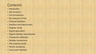 The document provides an in-depth overview of the AMBA AXI protocol, emphasizing its key features, architecture, and transaction models, suitable for high-performance and low-latency system designs. It discusses separate channels for read/write operations, transaction ordering, and the protocol's compatibility with previous interfaces. Additionally, it covers extensions for low-power operation, transaction attributes, and the differences between AXI4 and AXI4-Lite specifications.