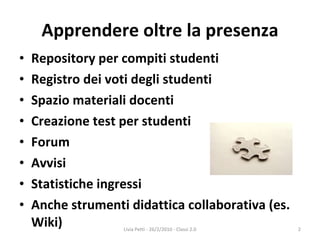 Il documento discute l'uso di ambienti di apprendimento online, evidenziando diverse piattaforme e strumenti open source come Moodle e Google Apps per la scuola. Viene proposto un modello di didattica collaborativa attraverso l'uso di social network e strumenti di condivisione come blog e video. Inoltre, il documento menziona l'importanza di mappe concettuali e timeline per rappresentare e organizzare le conoscenze.