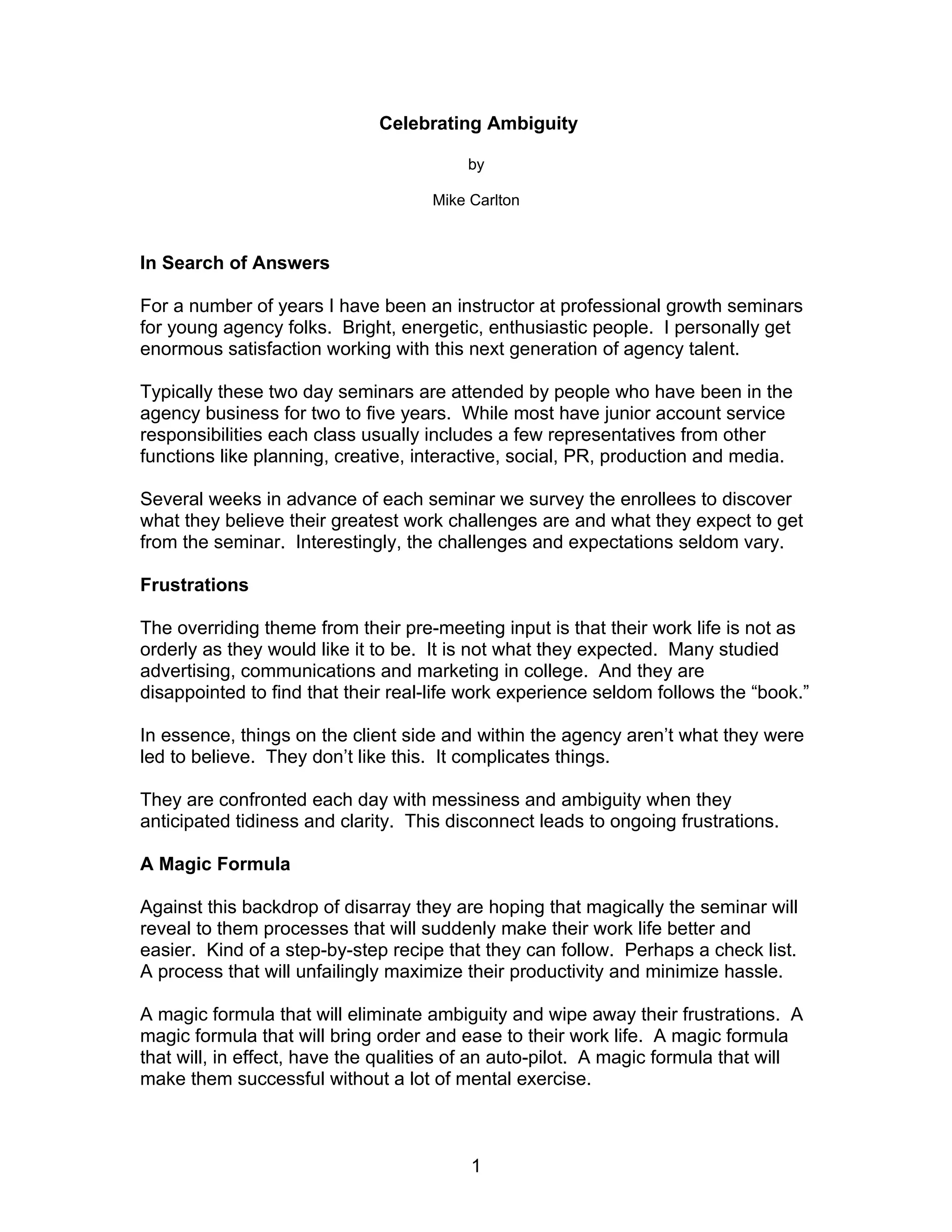 Mike Carlton discusses the challenges young agency professionals face in navigating the ambiguity of their work environments, which often differs from their orderly academic expectations. He emphasizes that rather than seeking a 'magic formula' for success, individuals should embrace ambiguity as a catalyst for creativity and innovative problem-solving. The seminar aims to shift participants' attitudes towards ambiguity, encouraging them to see it as a valuable and essential component of their careers.