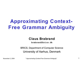 This document discusses approximating context-free grammar ambiguity, which is undecidable. It presents a characterization of ambiguity in terms of vertical and horizontal ambiguity. It then introduces an approximation framework based on over-approximations and shows that the regular approximation of context-free grammars (Amn) by Mohri and Nederhof is a decidable approximation that can determine if a grammar is unambiguous.