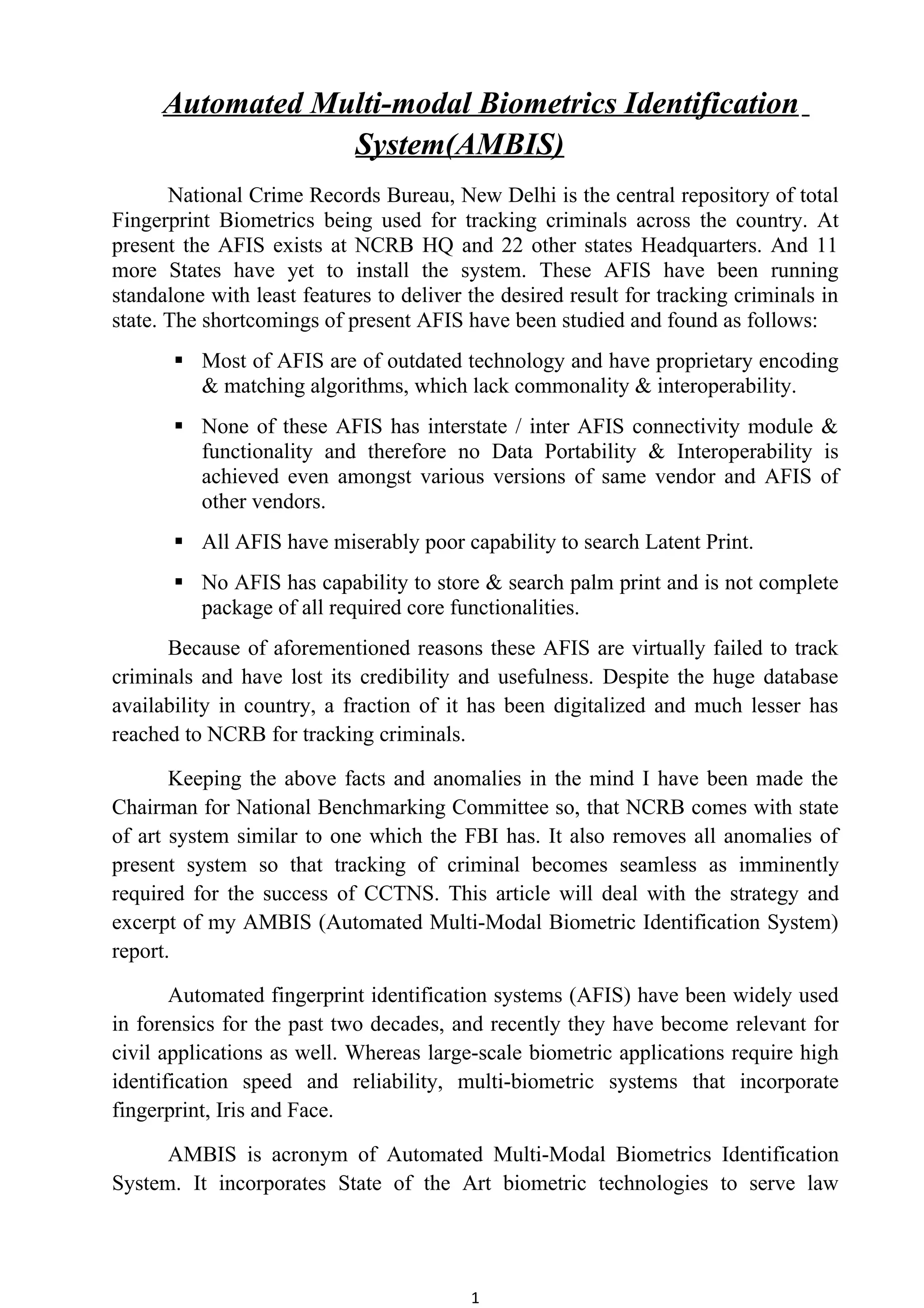 The document proposes the Automated Multi-Modal Biometrics Identification System (AMBIS) as an upgrade to existing Automated Fingerprint Identification Systems (AFIS) in order to more effectively track criminals. AMBIS would incorporate fingerprint, face, iris, and palm print biometrics. It would have a large, national database and enable interstate connectivity between fingerprint systems. The proposed AMBIS architecture would allow for dynamic updating of subsystem parameters based on analyzing responses from all components.