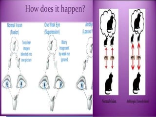 2. The main types of amblyopia are strabismic from squinting, stimulus deprivation from blocked vision, anisometropic from unequal refractive errors, isoametropic from high refractive errors in both eyes, and meridional from uncorrected astigmatism.