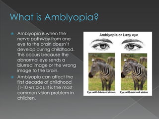 Amblyopia, commonly known as lazy eye, is an impairment of vision that occurs when the nerve pathway from one eye to the brain does not develop normally in childhood, usually caused by an eye turning inward or outward or one eye having significantly better focus than the other. It is the most common vision problem in children affecting ages 1-10. While full recovery is difficult after age 8, treatment through patching the good eye or applying eye drops can improve vision.