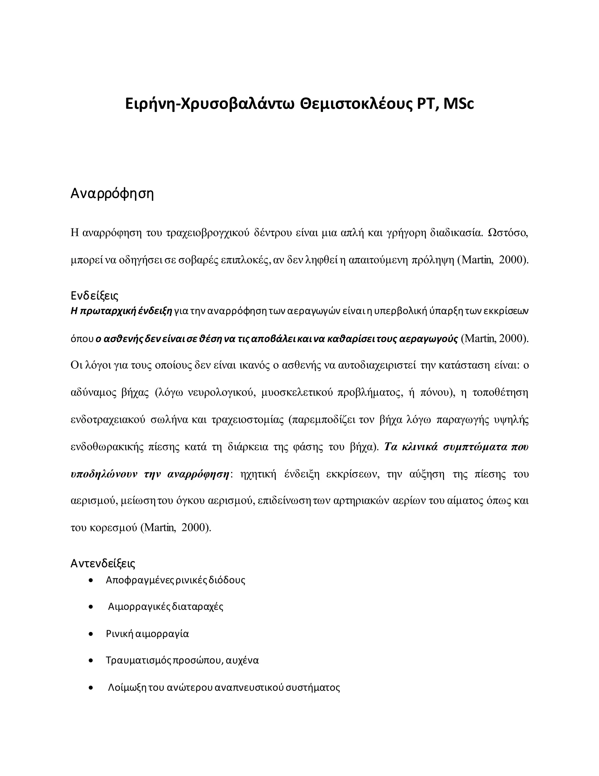 όπουο ασθενήςδενείναισεθέσηνα τιςαποβάλεικαινα καθαρίσειτους αεραγωγούς (Martin, 2000).
