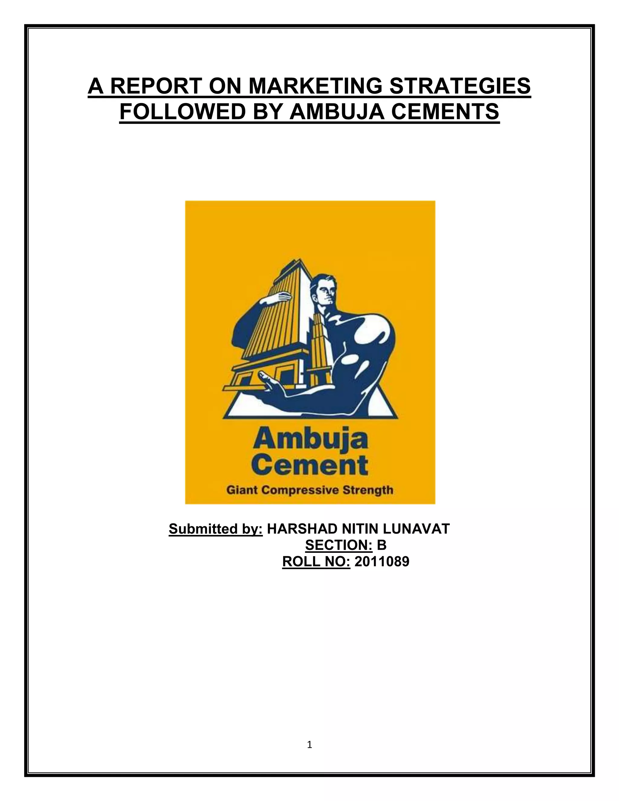 This document provides an overview of Ambuja Cement's marketing strategies. It discusses their product mix, which includes various types of cement. It describes their brand name strategy, noting they are named after their first plant's location. It also outlines their packaging, distribution channels through dealers and retailers nationwide, pricing approach, and promotional activities including sales personnel, seminars, and advertisements.