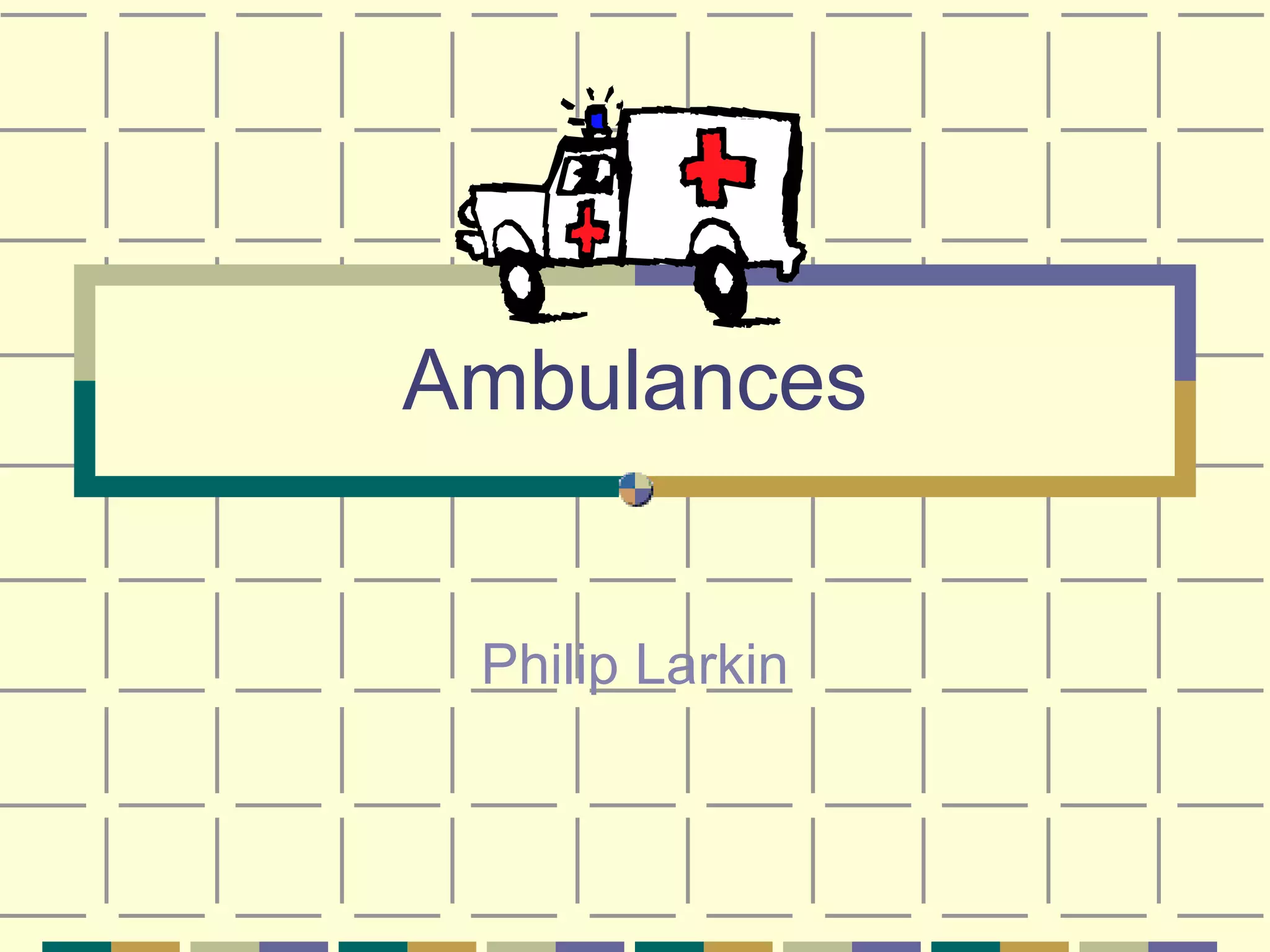 This poem is about how seeing an ambulance transporting a sick person can remind us of our own mortality. Ambulances privately carry away those whose lives may be drawing to a close. When confronted with death, we realize how insignificant our daily lives are and that death ultimately resolves the struggle of existence. The ambulance journey symbolizes life ending, as what defined the person loosens and they are taken far from loved ones, making what is left of their life distant to observers.