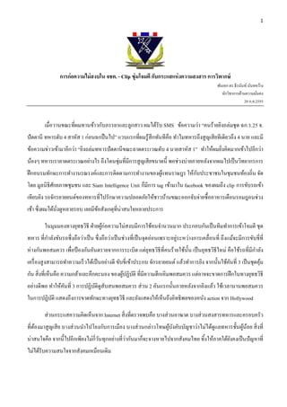 การก่อความไม่ สงบใน จชต. - Clip ซุ่มโจมตี กับกระแสแห่ งความสงสาร การวิพากษ์ พันเอก ดร.ธีรนันท์ นันทขว้าง นักวิชาการด้านความมันคง ่ 29 ก.ค.2555 เมื่อวานขณะที่ผมทานข้าวกับภรรยาและลูกสาว ผมได้รับ SMS ข้อความว่า “คนร้ายยิงถล่มชุด ฉก.ร.25 จ. ปั ตตานี ทหารดับ 4 สาหัส 1 ก่อนฉกปื นไป” แวบแรกที่ผมรู ้สึกทันทีคือ ทําไมทหารถึงสู ญเสี ยทีเดียวถึง 4 นาย และมี ข้อความข่าวเข้ามาอีกว่า “ยิงถล่มทหารปั ตตานี ขณะลาดตระเวณดับ 4 นายสาหัส 1” ทําให้ผมยิงคิดมากเข้าไปอีกว่า ่ น้องๆ ทหารเราลาดตระเวณอย่างไร ถึงโดนซุ่มที่มีการสู ญเสี ยขนาดนี้ พอช่วงบ่ายภายหลังจากผมไปเป็ นวิทยากรการ ั ฝึ กอบรมทักษะการทํางานรณรงค์และการติดตามการทํางานของผูแทนราษฎร ให้กบประชาชนในชุมชนท้องถิ่น จัด ้ โดย มูลนิธิศกยภาพชุมชน และ Siam Intelligence Unit ก็มีการ tag เข้ามาใน facebook ของผมถึง clip การขับรถเข้า ั เทียบยิง รถจักรยายยนต์ของทหารที่ไปรักษาความปลอดภัยให้ชาวบ้านขณะออกจับจ่ายซื้ออาหารเดือนรอมฎอนช่วง เช้า ซึ่งผมได้นงดูหลายรอบ เลยมีขอสังเกตุที่น่าสนใจหลายประการ ่ั ้ ในมุมมองทางยุทธวิธี ฝ่ ายผูก่อความไม่สงบมีการใช้คนจํานวนมาก ประกอบกันเป็ นทีมทําการเข้าโจมตี ชุด ้ ํ ่ ทหาร ที่กาลังขับรถซึ่ งถือว่าเป็ น ซึ่ งถือว่าเป็ นช่วงที่เป็ นจุดอ่อนเพราะอยูระหว่างการเคลื่อนที่ ถึงแม้จะมีการขับขี่ที่ ุ ั ํ ห่ างกันพอสมควร เพื่อป้ องกันอันตรายจากการระเบิด แต่ยทธวิธีที่คนร้ายใช้น้ น เป็ นยุทธวิธีใหม่ คือใช้รถที่มีกาลัง เครื่ องสู งสามารถทําความเร็ วได้เป็ นอย่างดี ขับขี่เข้าประกบ จักรยายยนต์ แล้วทําการยิง จากนั้นใช้คนที่ 3 เป็ นชุดคุม ั ้ กัน สิ่ งที่เห็นคือ ความกล้าและคึกคะนอง ของผูปฏิบติ ที่มีความฮึกเหิ มพอสมควร แต่อาจจะขาดการฝึ กในทางยุทธวิธี ้ ั อย่างดีพอ ทําให้คนที่ 3 การปฏิบติดูสับสนพอสมควร ส่ วน 2 คันแรกนั้นภายหลังจากยิงแล้ว ใช้เวลานานพอสมควร ั ั ในการปฏิบติ แสดงถึงการขาดทักษะทางยุทธวิธี และยังแสดงให้เห็นถึงอิทธิพลของหนัง action จาก Hollywood ั ส่ วนกระแสความคิดเห็นจาก Internet สิ่ งที่ตรวจพบคือ บางส่ วนอาฆาต บางส่ วนสงสารทหารและครอบครัว ที่ตองมาสู ญเสี ย บางส่ วนนําไปโยงกับการเมือง บางส่ วนกล่าวโทษผูบงคับบัญชาว่าไม่ได้ดูแลทหารชั้นผูนอย สิ่ งที่ ้ ้ ั ้ ้ น่าสนใจคือ จากนี้ไปอีกเพียงไม่กี่วนทุกอย่างที่ว่ากันมาก็จะจางหายไปจากสังคมไทย ทิ้งให้ภาคใต้ยงคงเป็ นปั ญหาที่ ั ั ไม่ได้รับความสนใจจากสังคมเหมือนเดิม