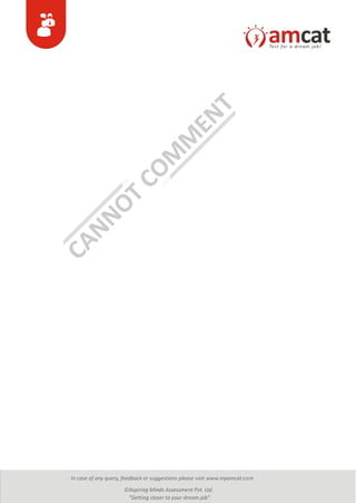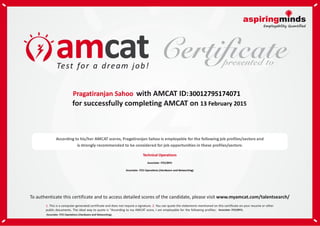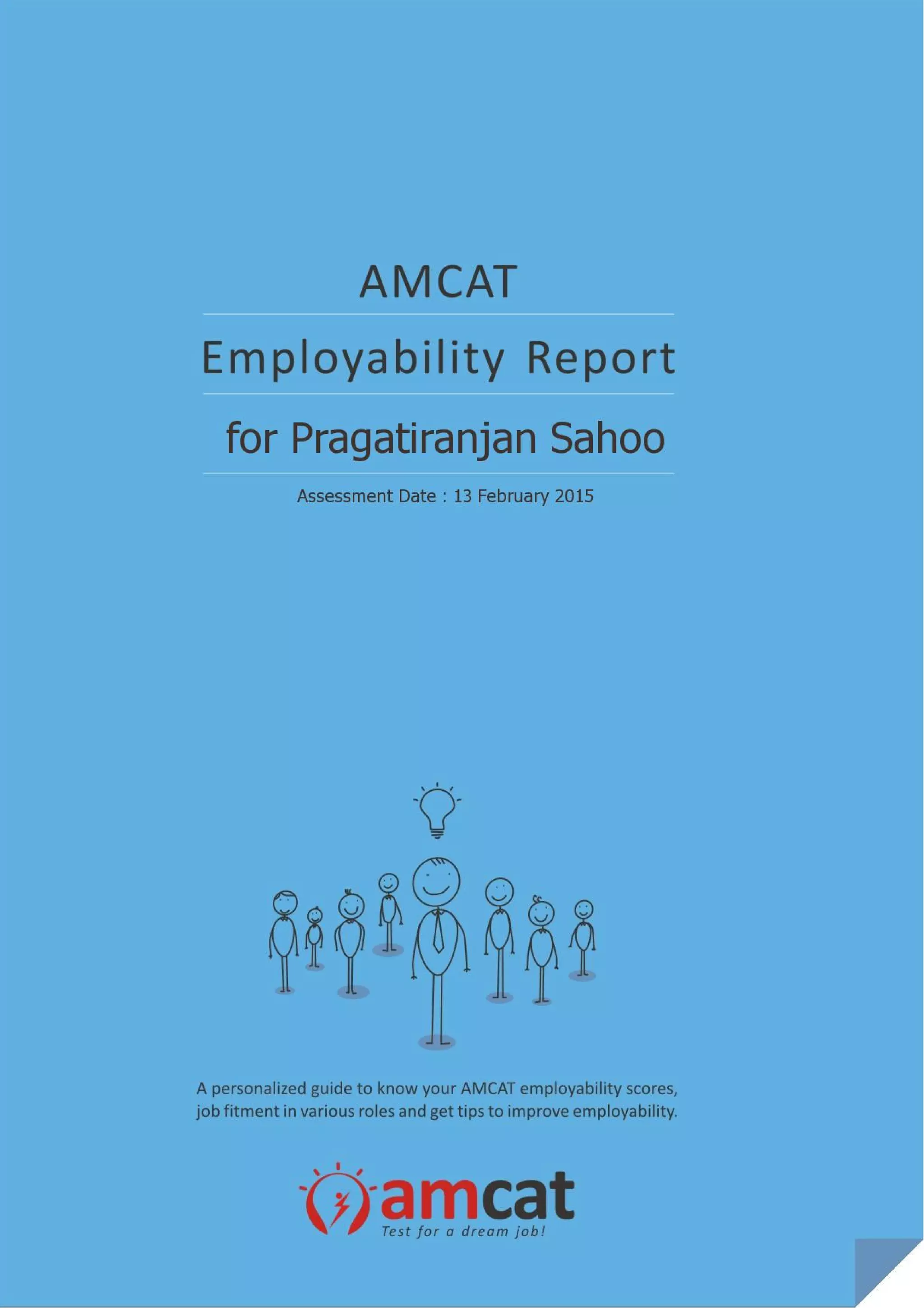 Pragatiranjan Sahoo received an AMCAT Employability Report that provides an analysis of his skills, personality, and career fitment for different industries and jobs. The report includes summaries of his AMCAT test scores in different modules, an analysis of his personality traits, and suggestions for how to improve areas of weakness and pursue career paths that match his strengths. It recommends that Pragatiranjan focus on profiles where his skills are strongest, explore profiles where he may have unconsidered potential, and work to improve skills needed for profiles that interest him but were identified as medium or low fit. The report aims to guide Pragatiranjan in developing an action plan to succeed at interviews and position himself