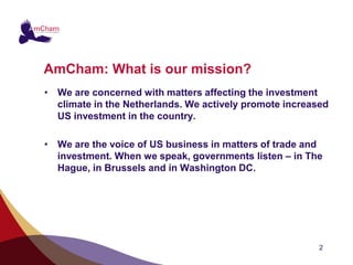 AMCHAM is a non-profit organization aimed at promoting US investment in the Netherlands and advocating for a favorable investment climate. Established in 1961, it represents American companies and Dutch firms engaged with the US, offering networking opportunities and focusing on issues like labor flexibility and taxation. Key priorities include stimulating innovation and maintaining stability in tax legislation to foster growth and attract further foreign investment.