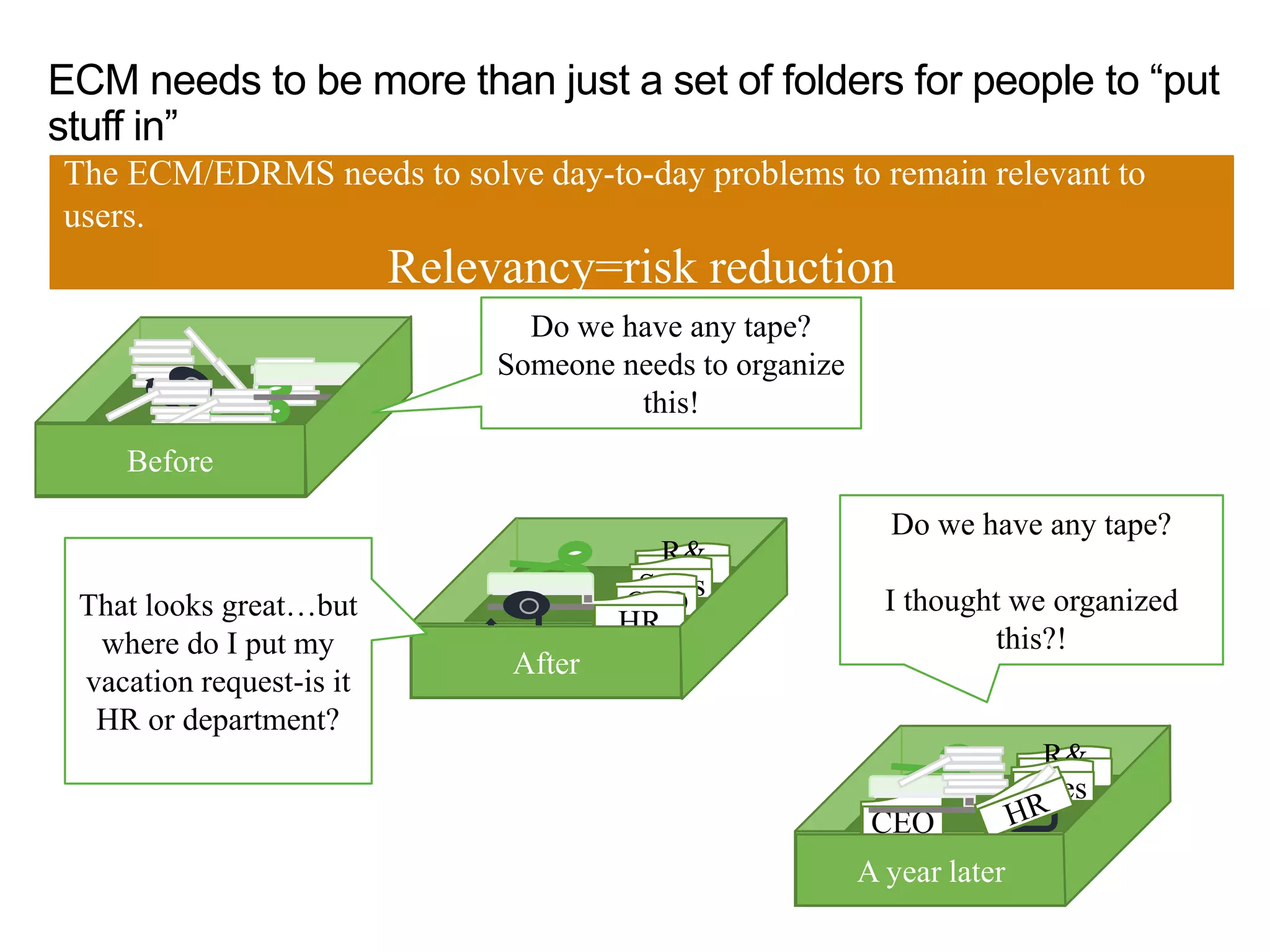 The document discusses the importance of effective records management and information organization to enhance user satisfaction and reduce risks in organizations. It emphasizes that ECM/EDRMS should not only focus on search functionalities but also ensure that information is well-structured and easily accessible throughout its lifecycle. By aligning document classification with user needs and providing appropriate tools and training, organizations can improve findability and compliance, ultimately minimizing information breaches.