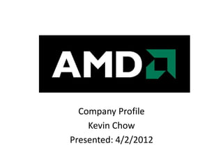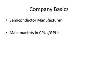 AMD is a semiconductor manufacturer founded in 1969 that designs and markets CPUs and GPUs. In 2011, AMD reported $6.57 billion in revenue and $491 million in net income. While AMD stopped manufacturing chips in 2008 to focus on design, it acquired ATI Technologies in 2006 and SeaMicro in 2012. AMD's "Fusion" CPUs, "Southern Islands" GPUs, and strong customer base position it for an important year ahead despite risks of failure in its industry.