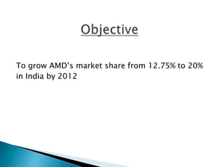 1) The document outlines AMD's strategy to grow its market share in India from 12.75% to 20% by 2012 through an alliance with Zenith Computers India.
