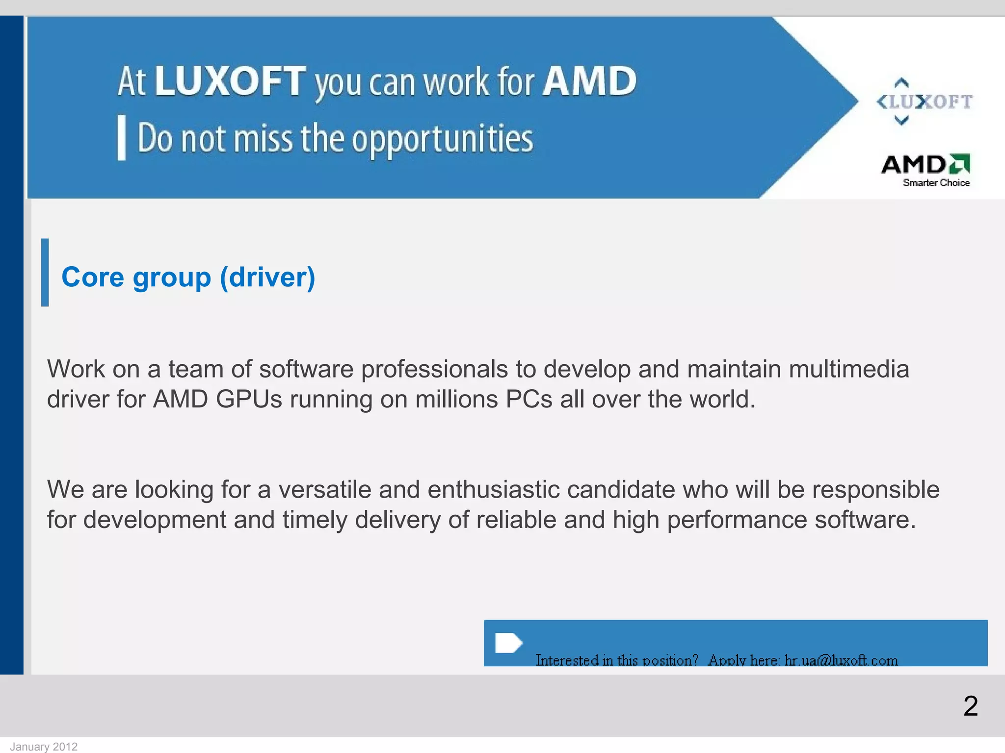1) A Core Group (Driver) position involves developing and maintaining multimedia drivers for AMD GPUs used in millions of PCs worldwide as part of a software team.