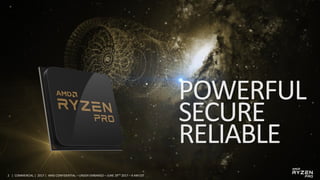This document presents AMD's Ryzen PRO line of processors for commercial and enterprise users. It highlights key features of the Ryzen 7 PRO 1700, Ryzen 5 PRO 1600 and Ryzen 3 PRO 1300 including their core/thread counts, frequencies, cache sizes and TDPs. It also shows benchmark results demonstrating the Ryzen 7 PRO 1700 and Ryzen 5 PRO 1600 outperforming competing Intel Core i7 and Core i5 processors in various multi-threaded workloads by up to 116%. Additionally, it outlines the Ryzen PRO processors' security features, manageability and commercial support.