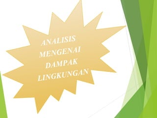 Dokumen ini menjelaskan tentang Analisis Mengenai Dampak Lingkungan (AMDAL), yang merupakan kajian penting untuk menilai dampak suatu proyek terhadap lingkungan. AMDAL bertujuan untuk mencapai keselarasan antara manusia dan lingkungan melalui pemanfaatan sumber daya alam yang bijaksana, dengan memperhatikan regulasi hukum yang berlaku. Proses penyusunan AMDAL melibatkan pemrakarsa, komisi penilai, dan masyarakat, serta terdiri dari beberapa dokumen penting seperti KA-ANDAL, ANDAL, RKL, dan RPL.