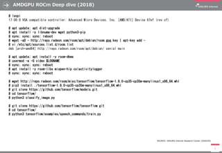 The document details the installation and setup process for AMD's ROCm platform on Linux, including necessary commands and packages like rocm-dkms and rocm-libs. It provides instructions for installing TensorFlow and running example scripts related to image classification and speech command training. The material is intended for users setting up ROCm for machine learning applications.