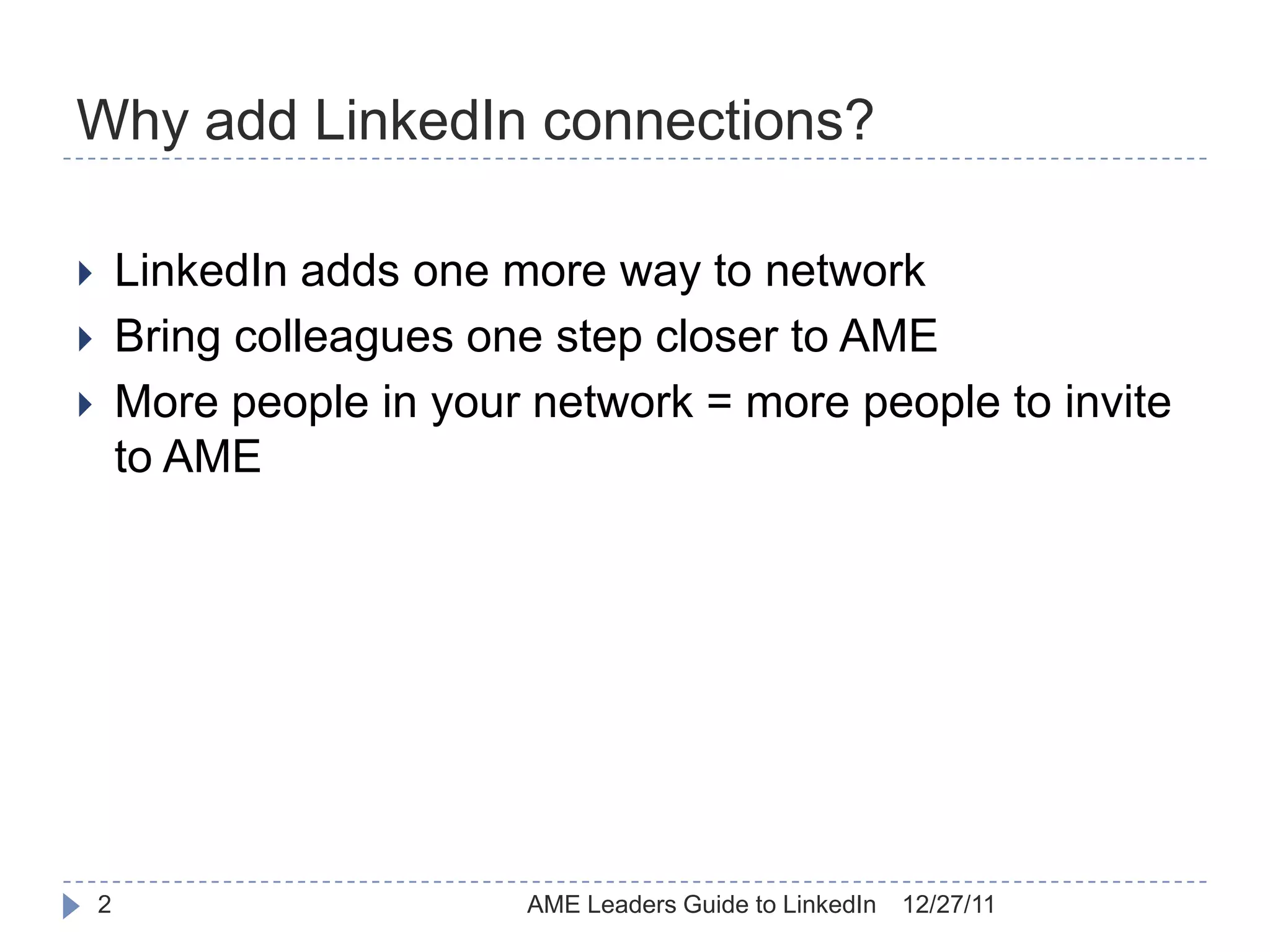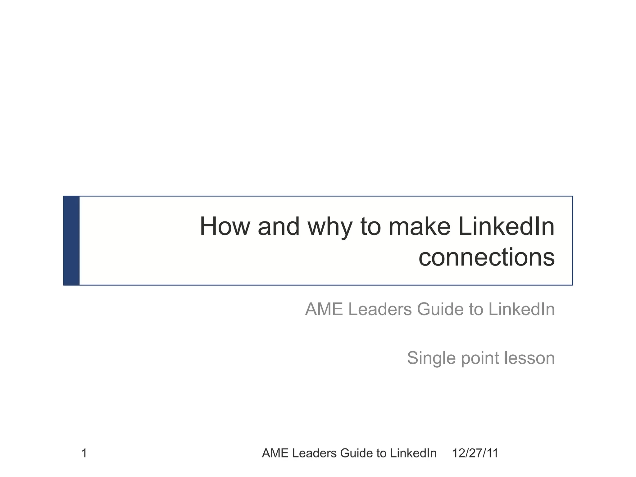 This document provides guidance on making connections on LinkedIn. It recommends connecting with people you know from real life by searching for colleagues and acquaintances. It also suggests connecting with people you meet in LinkedIn groups or in person by viewing their profile and sending a personalized invitation mentioning your shared connection or interaction. The document advises against using automated features like importing contacts, and emphasizes personalizing every LinkedIn message. The overall goal is to build relationships and mirror your real-life network online through LinkedIn.