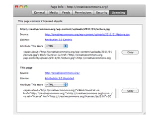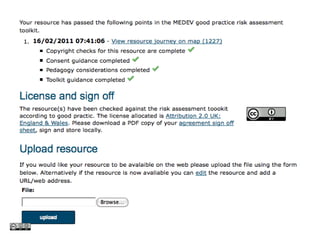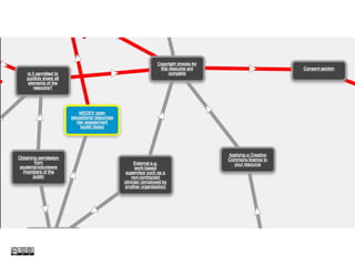 This document discusses open educational resources (OER) and related intellectual property issues. It defines OER as teaching materials that are freely available, and notes that adopting good practices with OER can save time and money. The document outlines UK copyright law and exceptions for fair use. It also discusses obtaining permissions, licensing schemes like Creative Commons, developing institutional policies, managing risks, and ensuring proper attribution and consent for recordings of people.