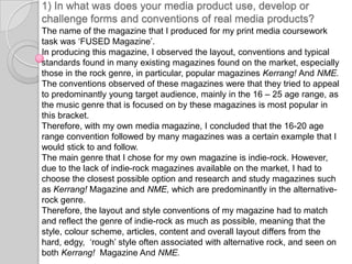 The document summarizes the evaluation of a print media magazine project titled "FUSED Magazine" produced by Amelia Larkin. The magazine was modeled after existing rock magazines like Kerrang! and NME but focused on the indie rock genre instead. The target audience was teenagers aged 16-21 interested in indie rock music. Feedback indicated the magazine's presentation and content successfully attracted this target demographic. Through constructing the magazine, the author learned photography and design skills using technologies like DSLR cameras and Adobe Photoshop. Looking back, the author felt their skills and adherence to the music theme improved from the preliminary task to the final magazine product.