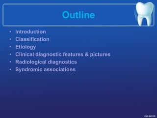 Amelogenesis Imperfecta is a condition affecting the development of dental enamel. It has several classifications depending on the specific enamel defect present, including hypoplastic (inadequate enamel), hypocalcified (no mineralization), and hypomaturation (failure of enamel to mature). The condition can be inherited in autosomal dominant, recessive, x-linked, or sporadic patterns. Diagnosis is based on family history, clinical examination showing discolored, sensitive teeth prone to disintegration, and radiographic findings of abnormal enamel appearance. It may occur alone or be associated with other systemic abnormalities in syndromes.
