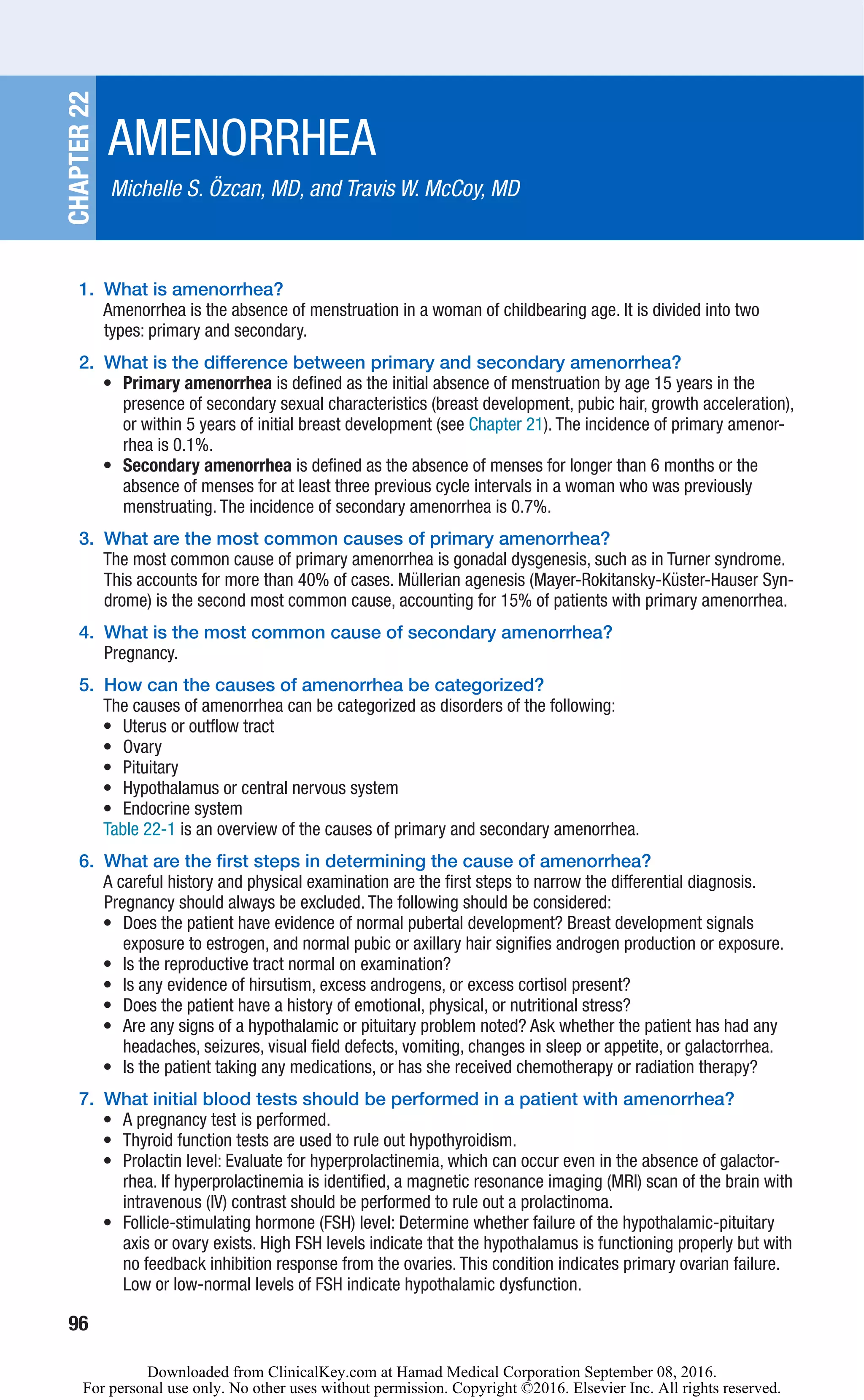 Amenorrhea is the absence of menstruation and can be primary or secondary. Primary amenorrhea refers to the absence of menstruation by age 15 in the presence of secondary sexual characteristics or by age 13 without characteristics. Secondary amenorrhea is the absence of menses for longer than 6 months in a previously menstruating woman. Common causes include pregnancy, polycystic ovarian syndrome, thyroid issues, and prolactinomas. An evaluation involves assessing sexual development, examining the reproductive tract, and obtaining levels of FSH, TSH, and prolactin to help determine the cause. Further tests like an MRI or karyotype may then be needed.