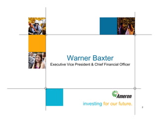 This document summarizes a presentation by Ameren, a regional electric and gas utility, at the Morgan Stanley Energy & Electricity Conference in April 2008. It discusses Ameren's business plan to achieve operational excellence, improve customer service, demonstrate environmental leadership, and maximize shareholder value. Financially, Ameren expects near-term regulatory lag due to rising costs but significant longer-term earnings growth from rate cases and increasing regulated investments. Regulated returns currently support earnings growth and regulated investment plans are expected to grow rate base and earnings.
