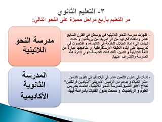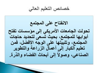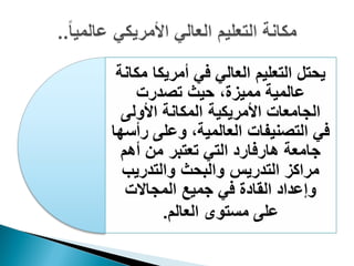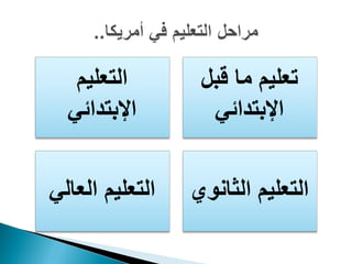 تستعرض الوثيقة نظام التربية والتعليم في الولايات المتحدة الأمريكية، بدءًا من مرحلة الحضانة إلى التعليم العالي، مع تحديد الأهداف الأساسية لتعليم الأطفال. تم الإشارة إلى مساعي تحسين مستوى التحصيل الدراسي في المواد الأساسية مثل اللغة الإنجليزية والرياضيات، بالإضافة إلى أهمية تطور المعلمين. كما تناولت الوثيقة تنوع البرامج الدراسية وطرق التدريس في مؤسسات التعليم العالي.