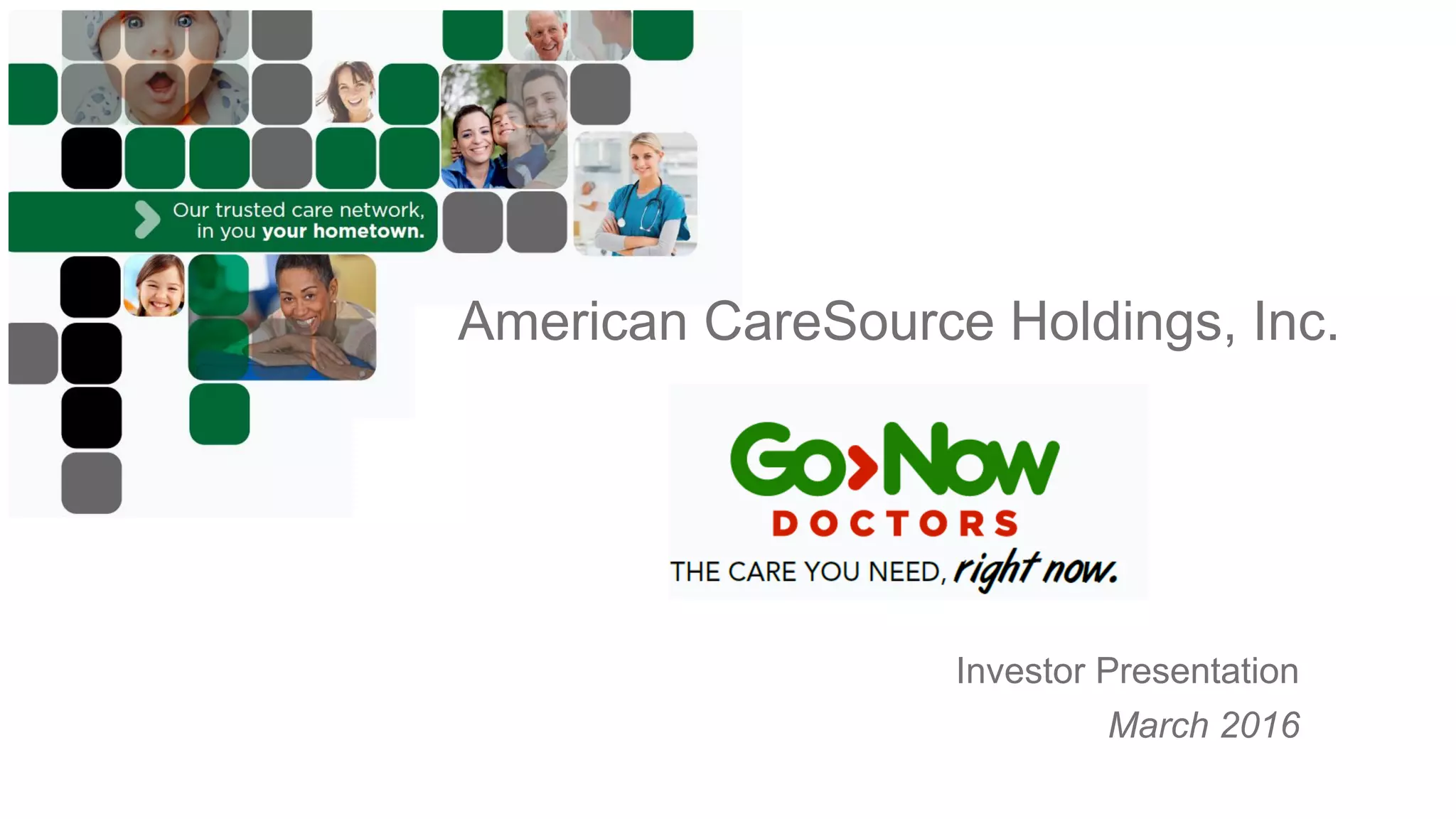 American CareSource Holdings is an owner and operator of urgent care medical centers pursuing an aggressive growth strategy through de novo clinic development and acquisitions. The company aims to have 51 centers by the end of 2017 and 81 centers by 2018. It focuses on operating conveniently located, affordable urgent care clinics in the Southeast U.S. that offer walk-in medical care without appointments. The company sees opportunities to consolidate a fragmented urgent care industry and achieve economies of scale. Its growth strategy relies on developing new clinics, acquiring competitors, and increasing revenue per existing clinic.