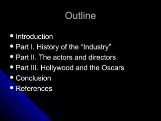 This document provides an overview of the history and development of the American film industry. It discusses how the United States became the leading film producer in the world in the 1920s. It outlines the major stages in the evolution of the industry from the early 1900s through recent decades, including the growth of Hollywood as the center of production and the rise of blockbuster films. Key people such as directors, actors, and studios that have shaped American cinema are also mentioned.