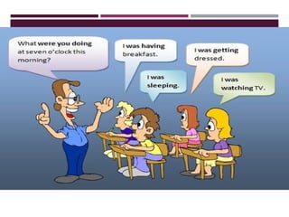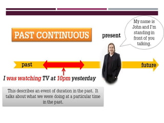The document explains the usage and formation of past simple and past continuous tenses in English, providing examples with both regular and irregular verbs. It outlines how to form affirmative, negative, and interrogative sentences, as well as when to use these tenses in relation to past actions. Additionally, it includes exercises for practice to reinforce understanding of these grammatical concepts.