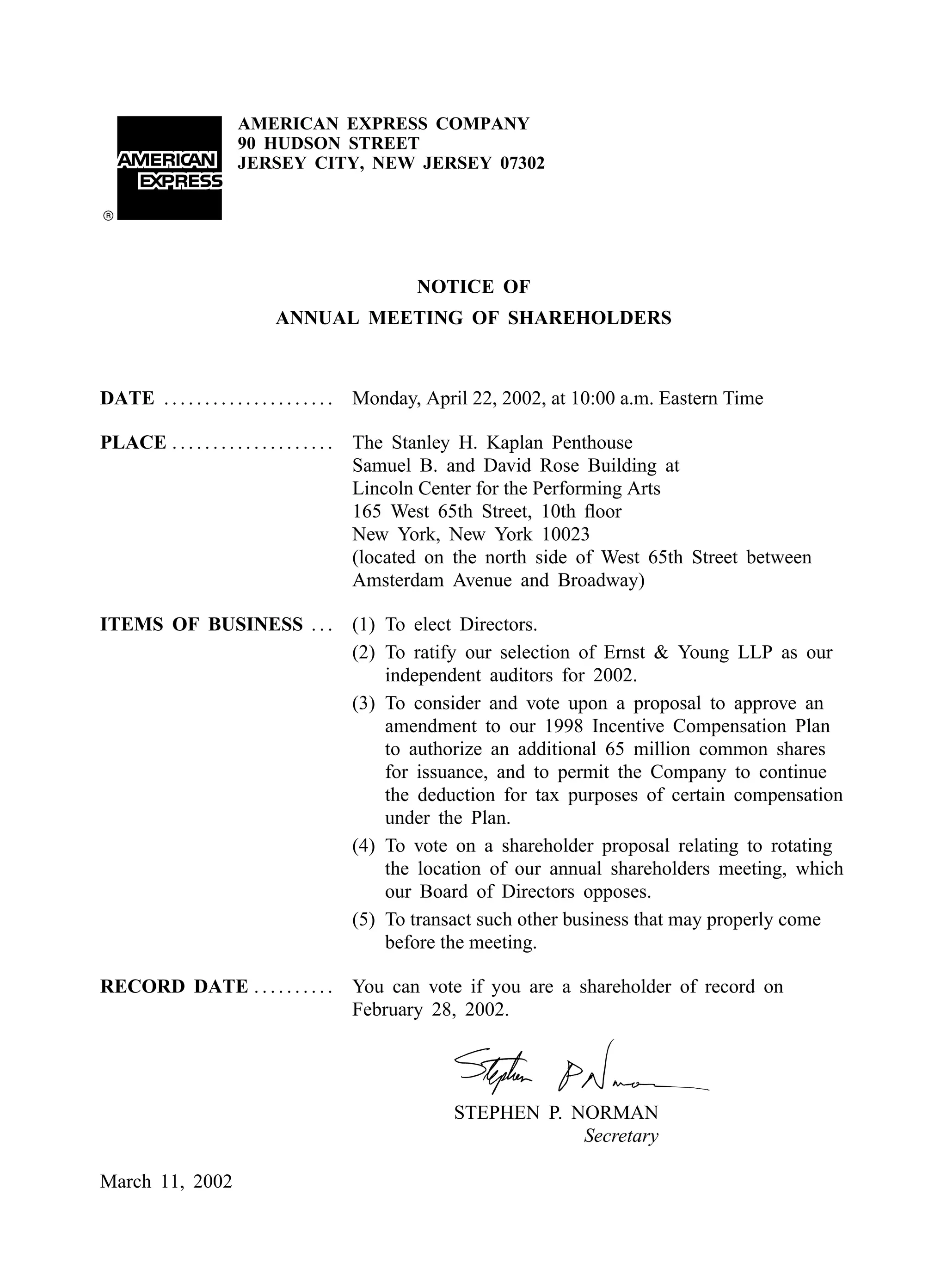 This document is a notice for the annual meeting of shareholders of American Express Company to be held on April 22, 2002. It provides information on the time and location of the meeting, the items of business to be voted on including electing directors and ratifying the selection of auditors, and instructions on how and by when shareholders can vote.