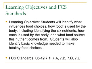 This document provides an overview of nutrition and the six essential nutrients - carbohydrates, proteins, fats, cholesterol, vitamins, and minerals. It defines each nutrient, explains its role in the body, food sources, and basic guidelines for a healthy diet. The key points are that nutrition provides fuel for the body, calories measure energy from food, and making wise choices about the nutrients and amounts consumed is important for health and well-being.