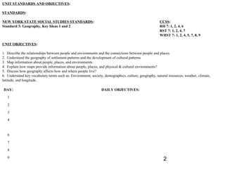 The document provides standards and objectives for a unit on American geography. It includes four unit objectives related to describing relationships between people and environments, understanding settlement patterns and cultural development, mapping geographic information, and explaining how maps provide geographic and cultural information. It also lists five themes of geography to be covered: location, place, human-environment interaction, movement, and region. Daily lessons will cover physical features, natural resources, weather, climate, and key geography terms.