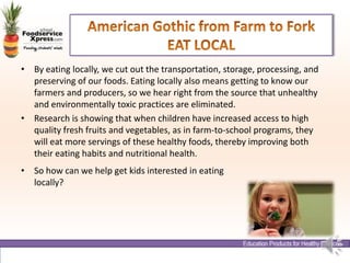 The document discusses the importance of eating locally to improve children's nutrition and support local farmers. It promotes a poster inspired by Grant Wood's painting 'American Gothic,' which visually encourages the concept of local food sourcing. The poster is available for purchase online, priced at $14.95, with discounts for bulk orders.