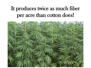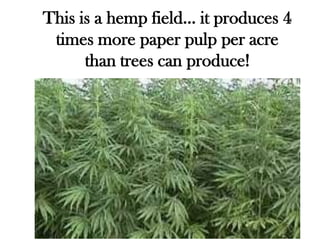 This document discusses the benefits of growing hemp over other crops. It produces higher yields than other crops per acre for paper pulp, fiber, and edible oil. Hemp also produces better quality paper, fabric, and oil. While hemp was an important crop for early American founders, its production was later banned due to propaganda associating it with marijuana. Growing hemp worldwide could help reduce the potency of marijuana crops through cross-pollination. The document advocates for America to regain its founders' vision of hemp as a valuable agricultural crop.