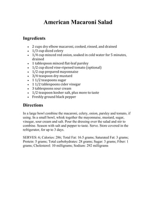 This document provides a recipe for American Macaroni Salad. It calls for cooking elbow macaroni and mixing it with diced vegetables like celery and red onion. A dressing is made by whisking together mayonnaise, dry mustard, sugar, cider vinegar, sour cream and salt. The dressing is poured over the macaroni and vegetable mixture and seasoned with salt and pepper. The salad serves 6 people with 286 calories per serving.