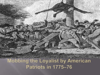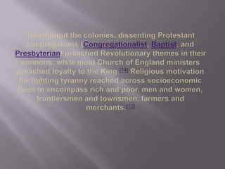 The American Revolution was a political upheaval in which the 13 American colonies rejected British rule and formed an independent nation. Dissatisfaction grew due to taxation without representation and harsh legislation from Parliament restricting settlement and trade. Inspired by Enlightenment ideas of natural rights and republicanism, Patriots and Loyalists took sides as tensions escalated. Events like the Boston Massacre, the Tea Party, and battles at Lexington and Concord marked the start of armed conflict. On July 4, 1776, the Declaration of Independence was approved, establishing the United States.