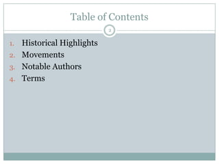 American Romanticism was a literary movement that emerged in response to industrialization and emphasized emotion, nature, and the individual. Notable authors of the period included Ralph Waldo Emerson, Henry David Thoreau, Edgar Allan Poe, and Nathaniel Hawthorne, who wrote about transcendentalism, nationalism vs. sectionalism, and the dark side of human nature. The movement also saw the rise of popular poets like Henry Wadsworth Longfellow who celebrated American culture and heritage.