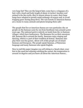 The American Samoa National Park is located in the United States territory in the South Pacific Ocean and consists of 3 volcanic islands and mountainous islands covered in tropical rainforest. The park protects the area's ecosystems, which include rainforests, coral reefs, sea turtles, bats with 5 foot wingspans, and humpback whales. The Samoan people have lived in American Samoa for around 3,000 years and continue many of their traditions, including singing, dancing, and games that are part of their culture and history.