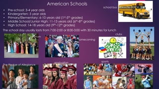 The document provides information about the American school system and typical items found in backpacks and classrooms for 6th grade students. It describes the different school levels from pre-school through high school. It then lists common classroom materials, school subjects, and activities. Finally, it presents exercises and materials for practicing vocabulary related to schools.