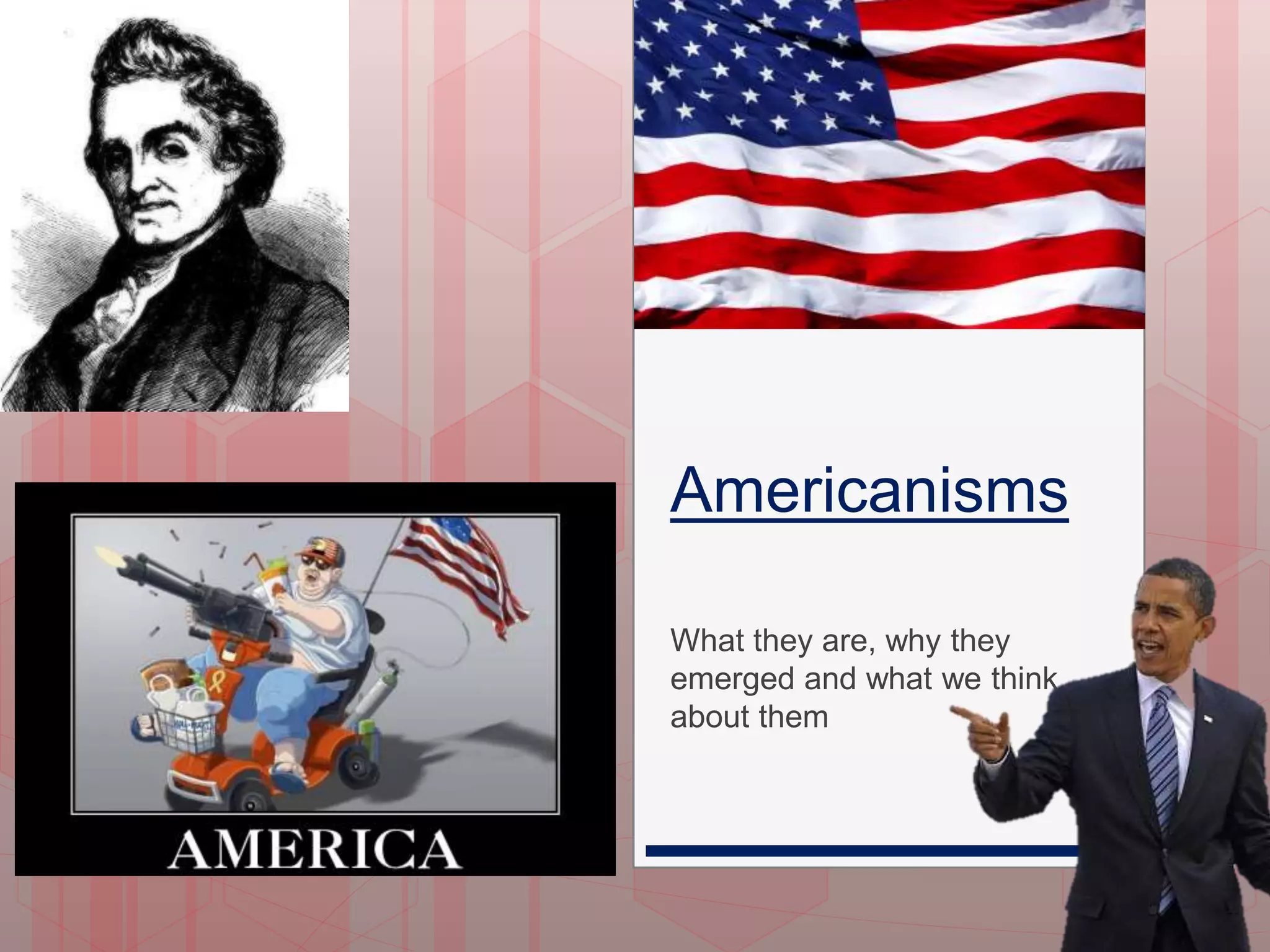 Americanisms emerged due to Noah Webster's advocacy for establishing an "American standard" of English in the late 18th century. His dictionaries introduced spellings and pronunciations that differed from British English. Throughout the 19th century, thousands of new American vocabulary words were coined from sources like Spanish and Native American languages. Today, Americanisms in vocabulary, grammar, and pronunciation like "math" instead of "maths" and "regular" instead of "medium" are increasingly used globally, raising questions about what constitutes "good" or "correct" English between countries.