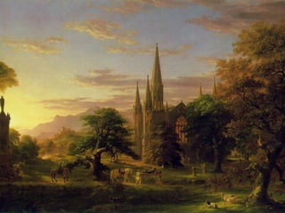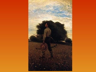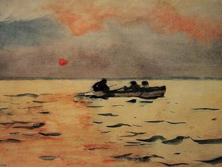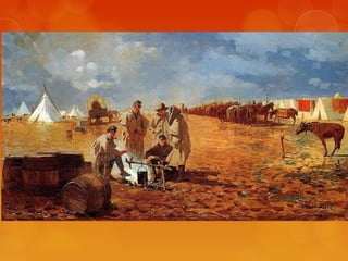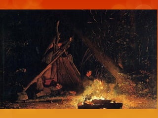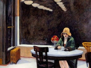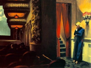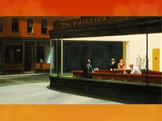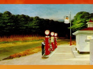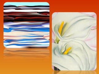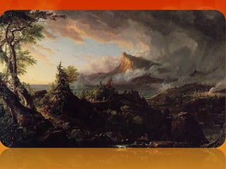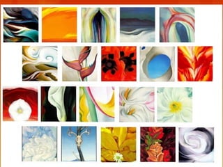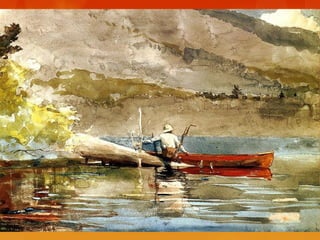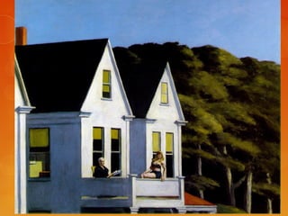 This document provides brief biographies of five American painters: Thomas Cole, Winslow Homer, Jackson Pollock, Georgia O'Keeffe, and Edward Hopper. It describes their backgrounds, artistic styles and contributions. Thomas Cole is identified as the founder of the Hudson River School. Winslow Homer is known for his marine paintings and graphic designs. Jackson Pollock was an influential abstract expressionist. Georgia O'Keeffe painted flowers and landscapes in an abstract style. Edward Hopper created realistic paintings of urban and rural American scenes.