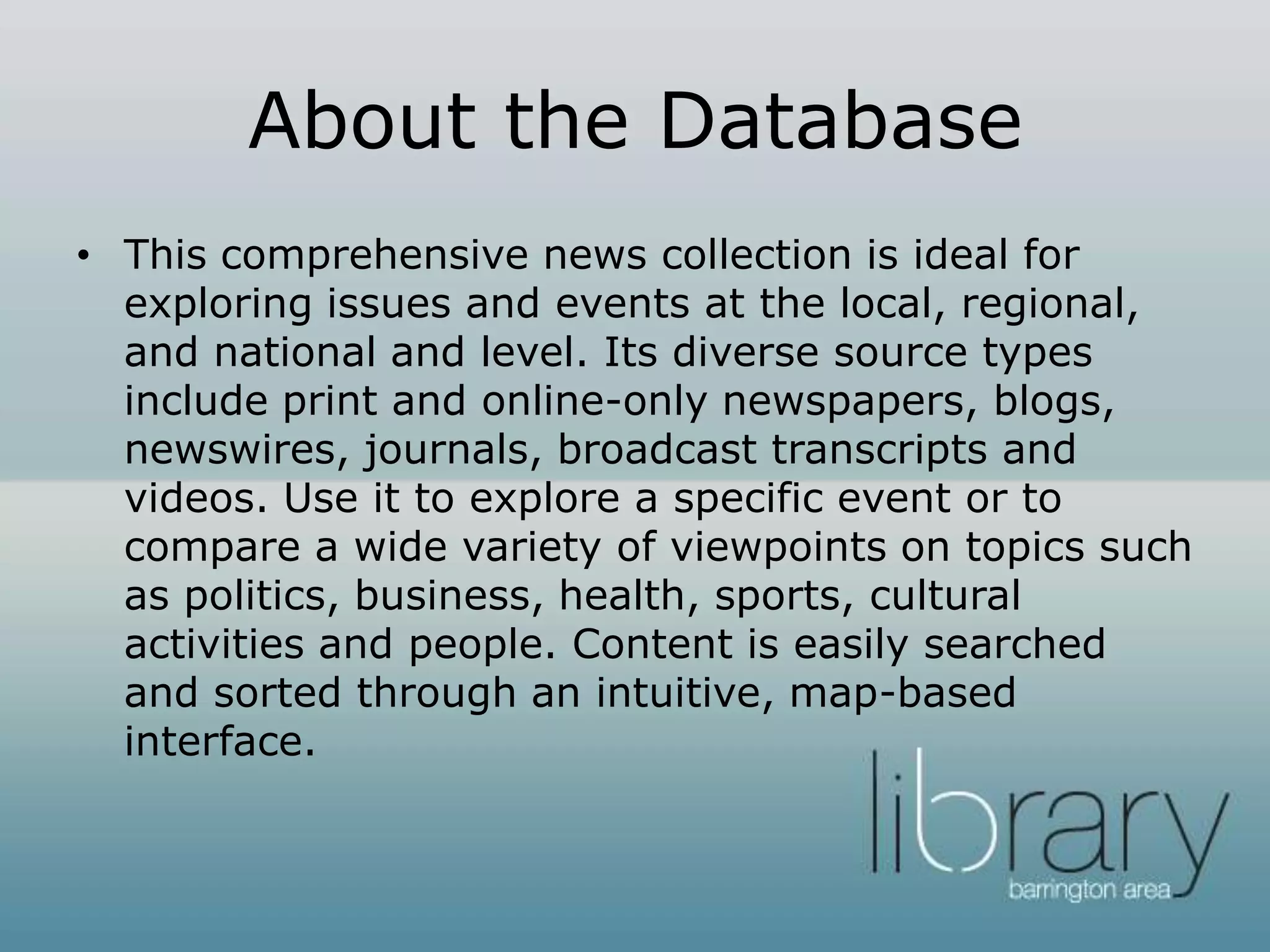 The document provides information about the America's Newspapers database offered by the Barrington Area Library, highlighting its comprehensive collection of news sources for exploring various topics. Users can access the database through a library card, personalize their experience by creating an account, and utilize features to search, filter, and save articles. Additionally, contact details for assistance and information on other business resources are provided.