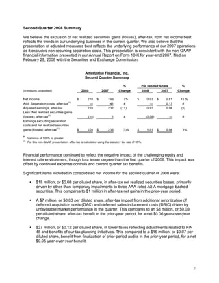 Ameriprise Financial reported second quarter 2008 results, with net income increasing 7% year-over-year to $210 million. Earnings per share increased 15% to $0.93. Excluding realized losses and prior year separation costs, earnings per share increased 3% to $1.01. Total revenues declined 8% to $2.0 billion due to market depreciation. The company maintained a strong capital position and increased its quarterly dividend by 13%.