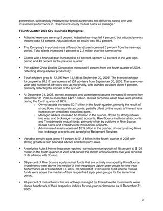 - Ameriprise Financial reported income before discontinued operations of $111 million for Q4 2005, down from $226 million in Q4 2004, primarily due to one-time separation costs. - Adjusted earnings, which exclude one-time items, decreased 4% to $193 million compared to $202 million in Q4 2004, due to a lower tax provision in 2004. Revenues grew 5% to $1.9 billion. - Key highlights included a 6% increase in mass affluent clients, higher advisor productivity, improved investment performance, and a 5% increase in owned, managed, and administered assets to over $428 billion.