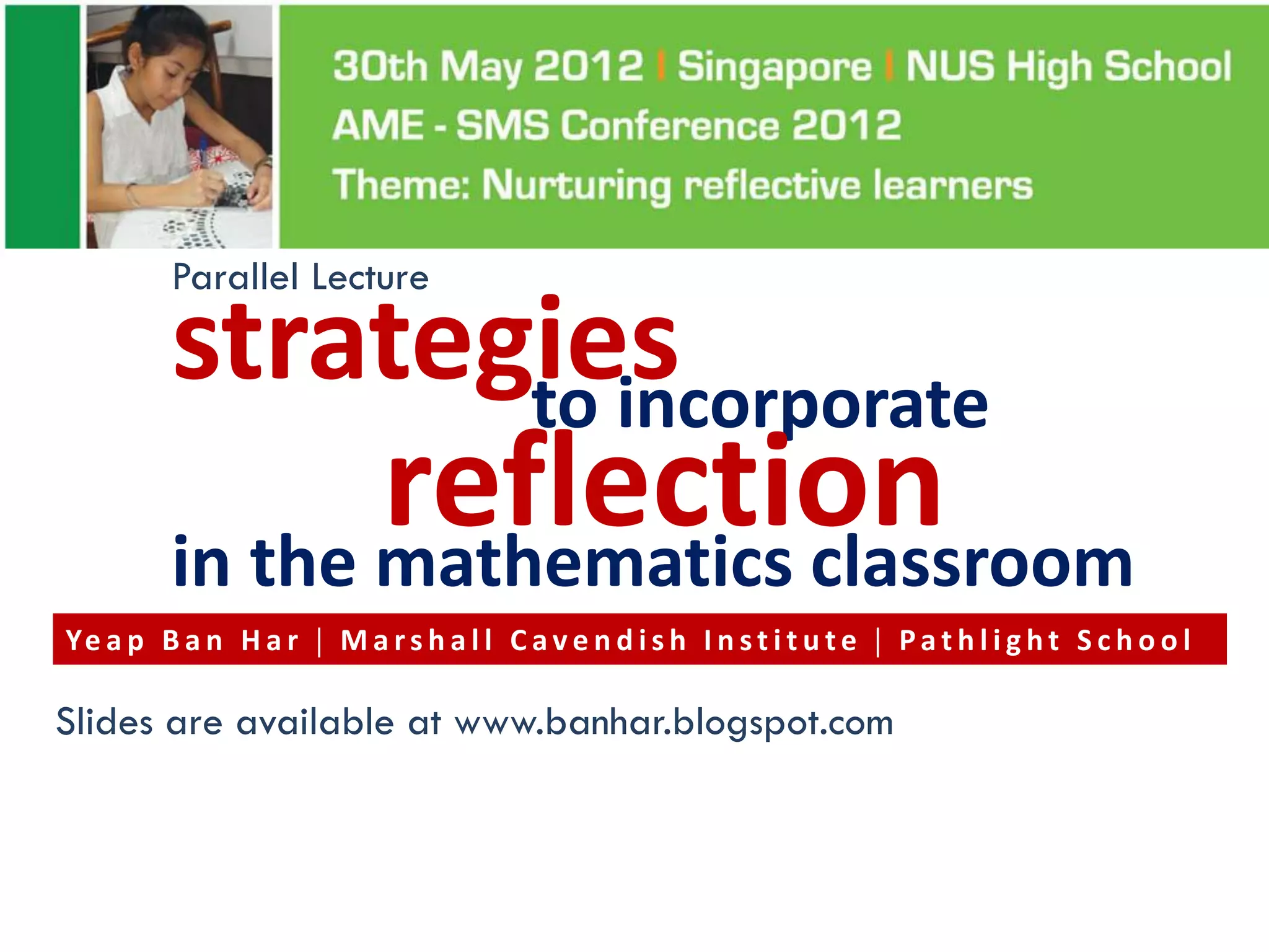 This lecture discusses strategies for incorporating reflection in mathematics classrooms. It provides examples of reflection techniques that can be used in both teacher-centered lessons like lectures as well as student-centered lessons like group work. Some strategies mentioned include using board writing, math journals, student explanations, self-assessments, problem-solving approaches, and questioning techniques to encourage students to re-examine their thinking. The goal is to promote deep learning through reflection on mathematical concepts and ideas.
