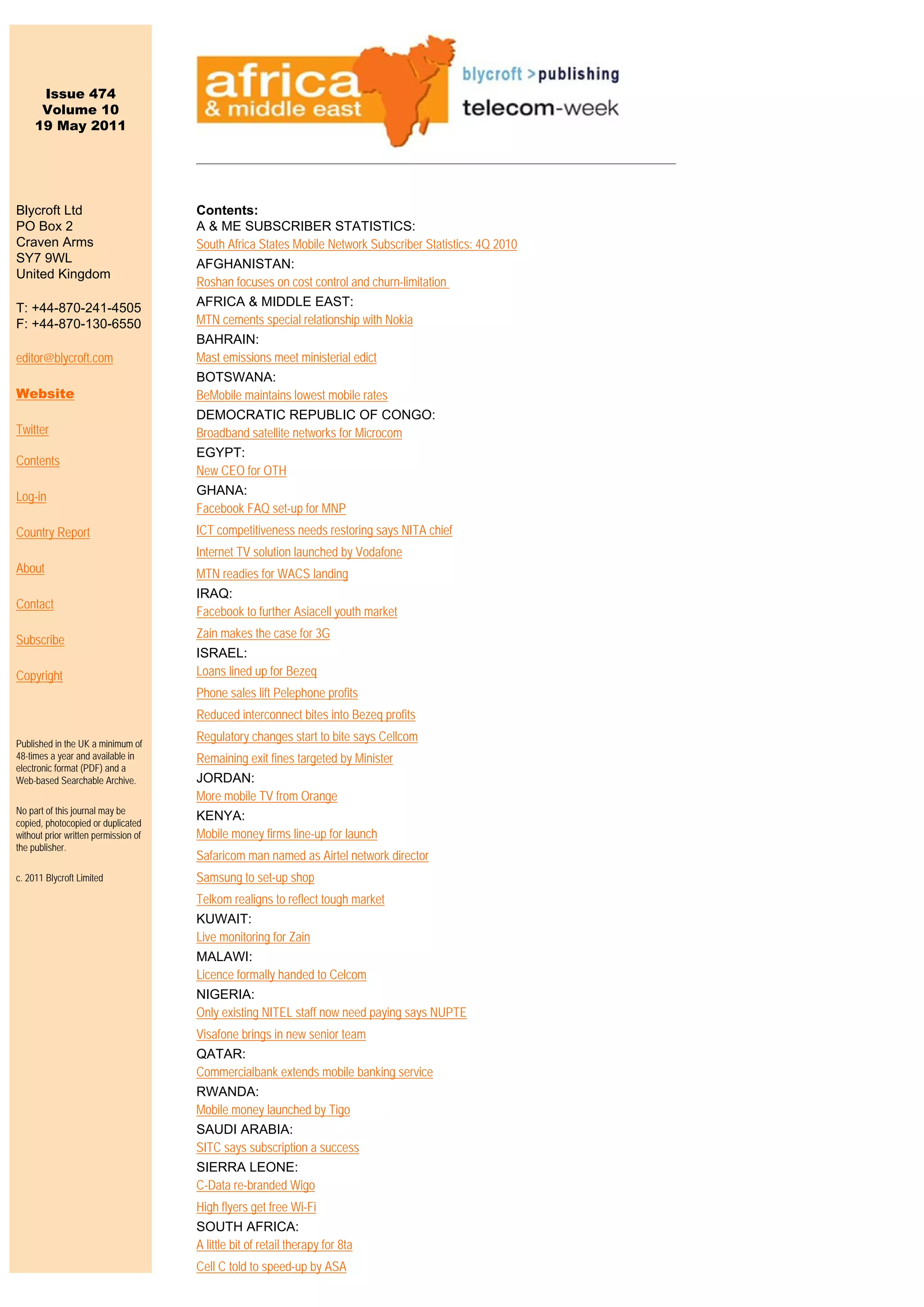 The document provides mobile network subscriber statistics for South Africa and other African states for the 4th quarter of 2010. It shows the total subscribers and market share for major mobile operators in countries such as Botswana, Lesotho, Malawi, Mauritius, Namibia, and South Africa. Overall, total mobile subscribers across the region grew by 5.4% year-over-year to 63.49 million in Q4 2010. Mobile penetration rates increased from 81% to 85% over the same period.
